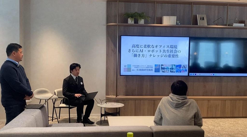 三菱地所様のフレキシブルオフィスの記者会見で、iU組織研究機構として雇用関連の先進技術(AI・ロボットの職場活用)対応を行うことを発表しました